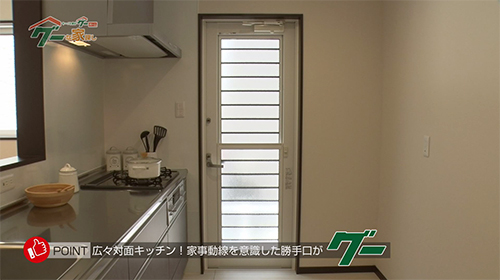 グーポイント①「広々対面キッチン!家事動線を意識した勝手口がグー」