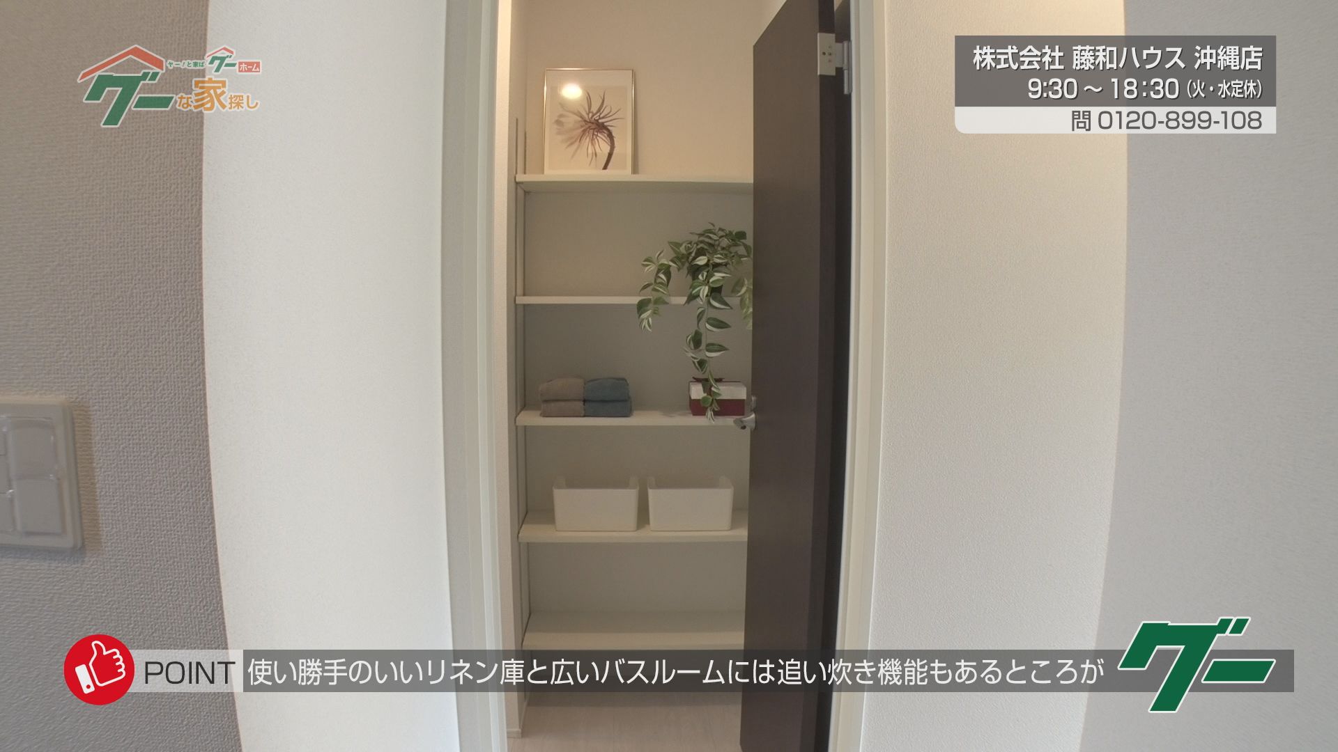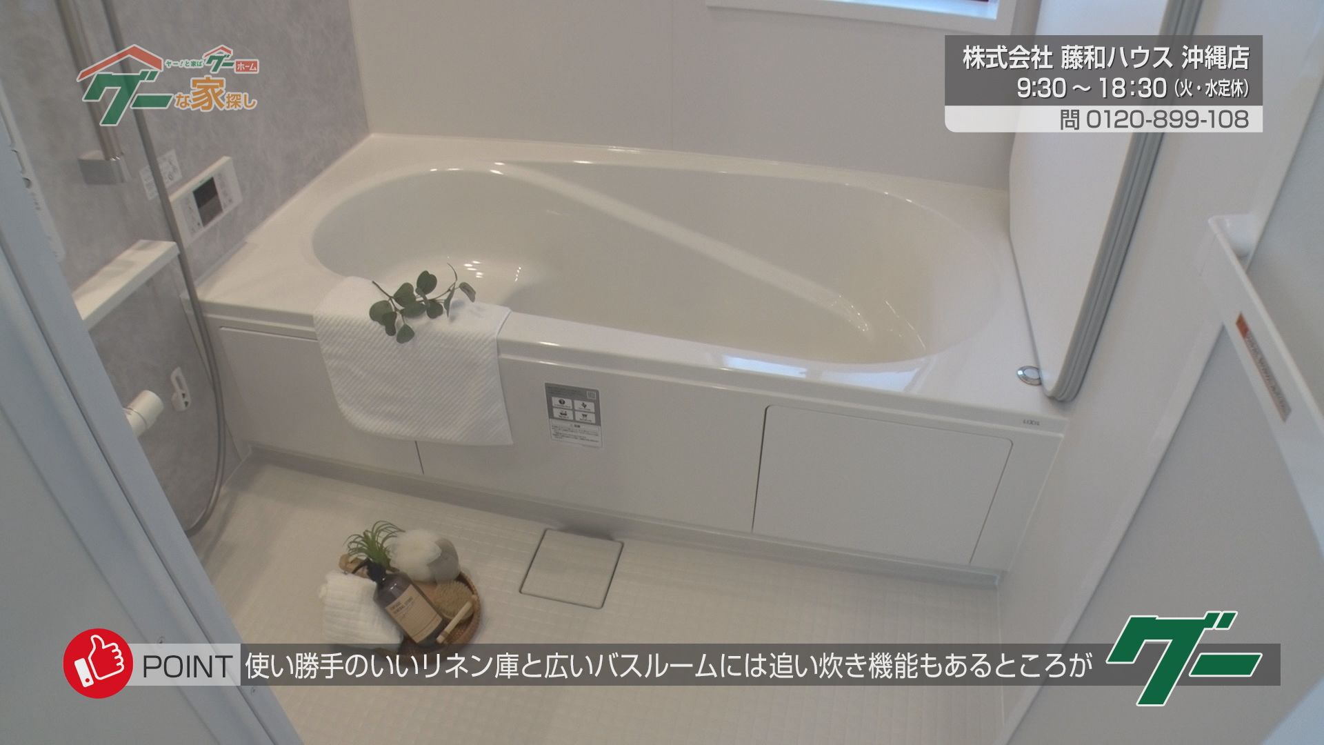 Gooポイント③「使い勝手のいいリネン庫と広いバスルームには追い炊き機能もあるところがグー」