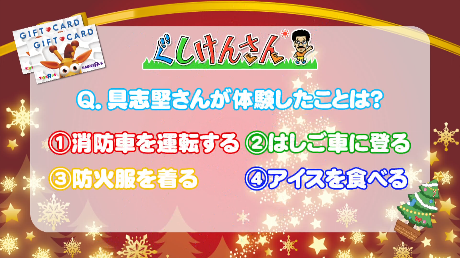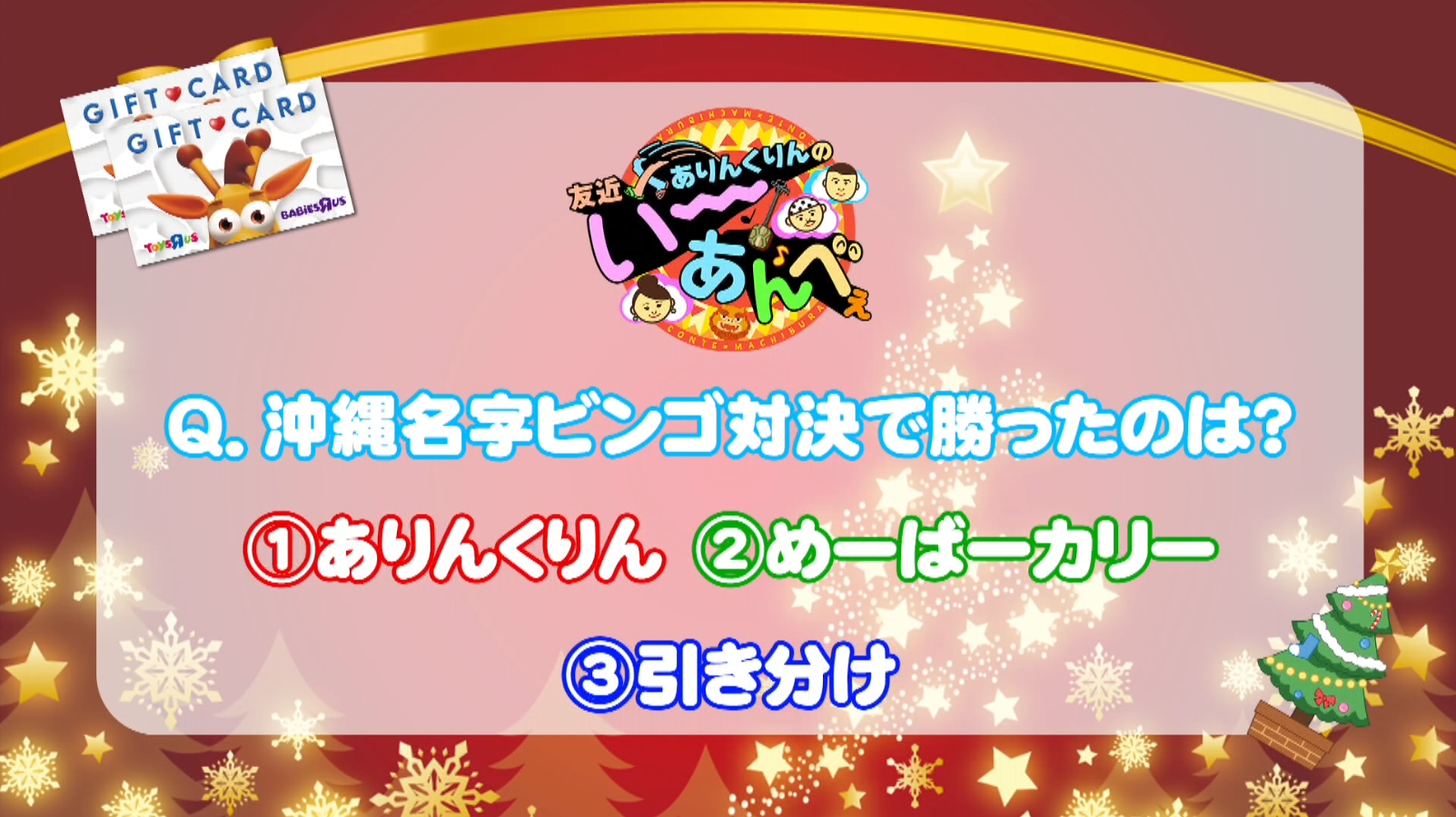 12月6日(土)放送の「ぐしけんさん」「友近×ありんくりんのい~あんべぇ」を見て、下記クイズの答えを応募フォームより入力し、応募完了となります。それぞれの正解者の中から抽選でトイザらスギフトカード1万円が当たる!