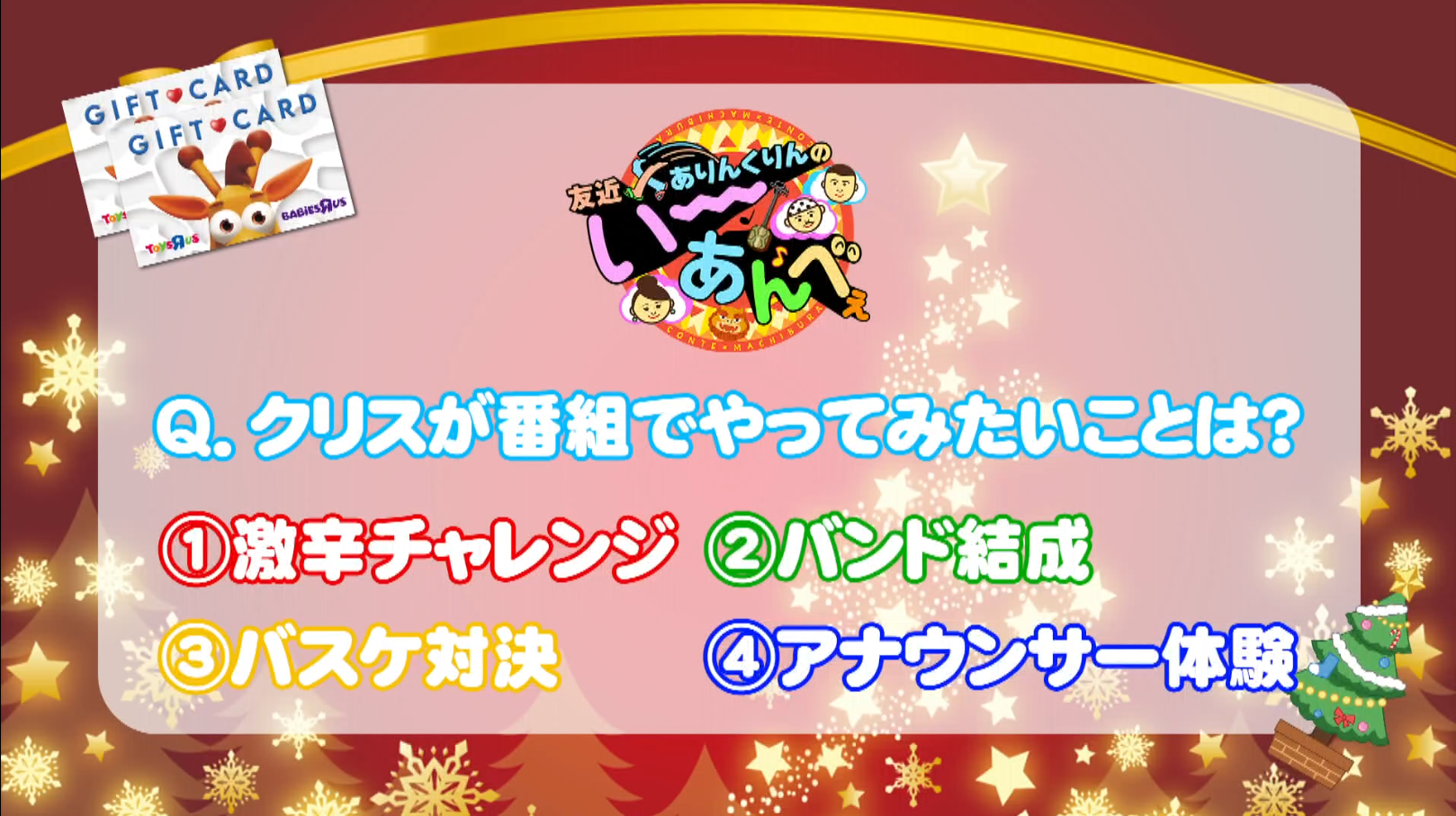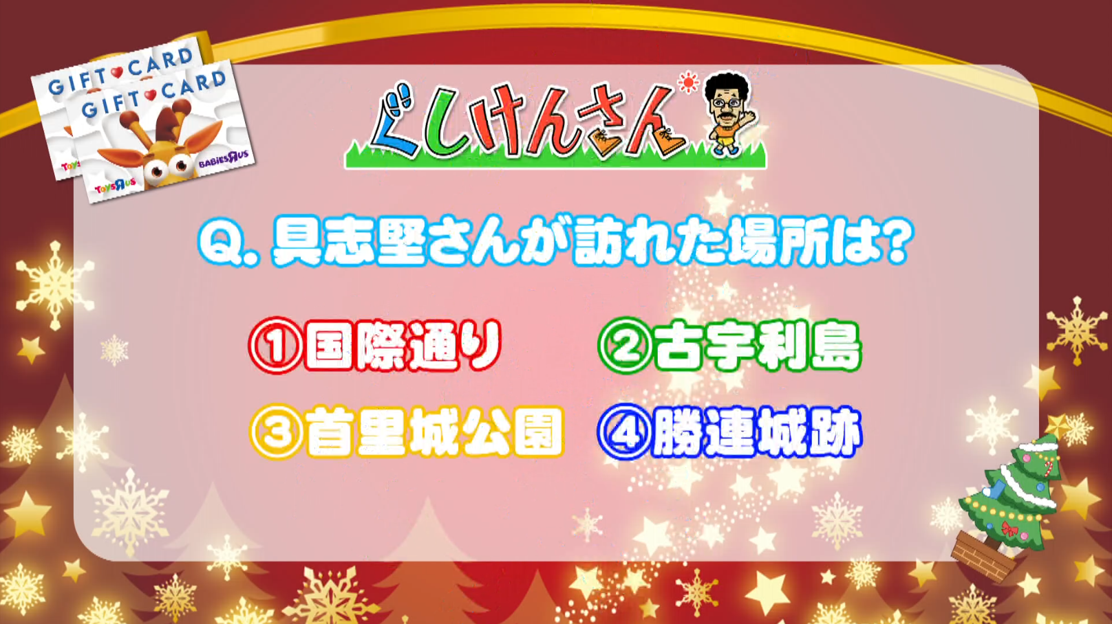 12月13日(土)放送の「ぐしけんさん」「友近×ありんくりんのい~あんべぇ」を見て、下記クイズの答えを応募フォームより入力し、応募完了となります。それぞれの正解者の中から抽選でトイザらスギフトカード1万円が当たる!