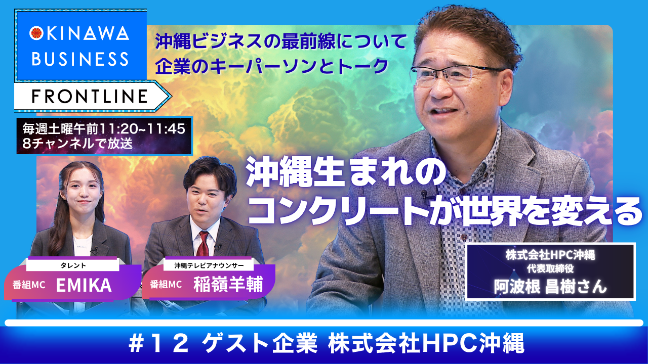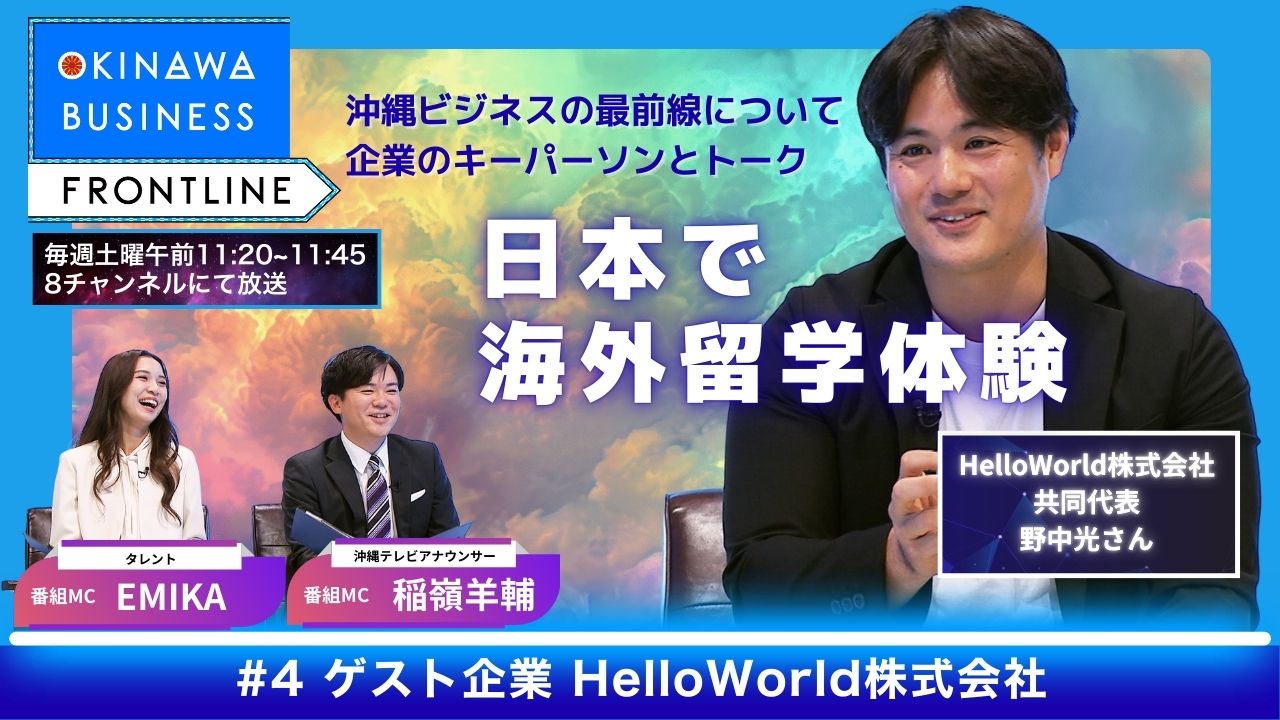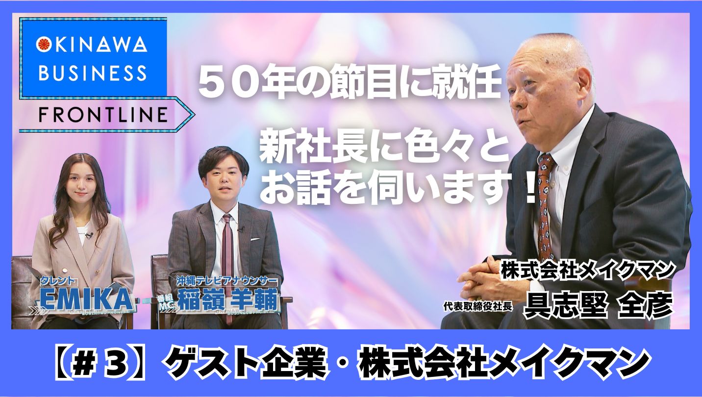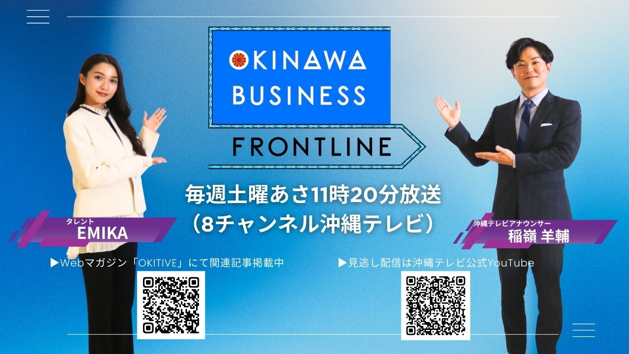 沖縄で日々生まれる新しいビジネスと、挑戦を続ける企業の“いま”に迫る経済トーク番組『OKINAWA BUSINESS FRONTLINE』。沖縄を舞台に、県内の有名企業や注目企業のキーマンがスタジオに出演。ここでしか聞けない経営の裏側や戦略など、トークと取材映像を交えて分かりやすく伝える。経済に関心の高いビジネス層はもちろん、幅広い視聴者に“沖縄経済の最前線”を届ける。