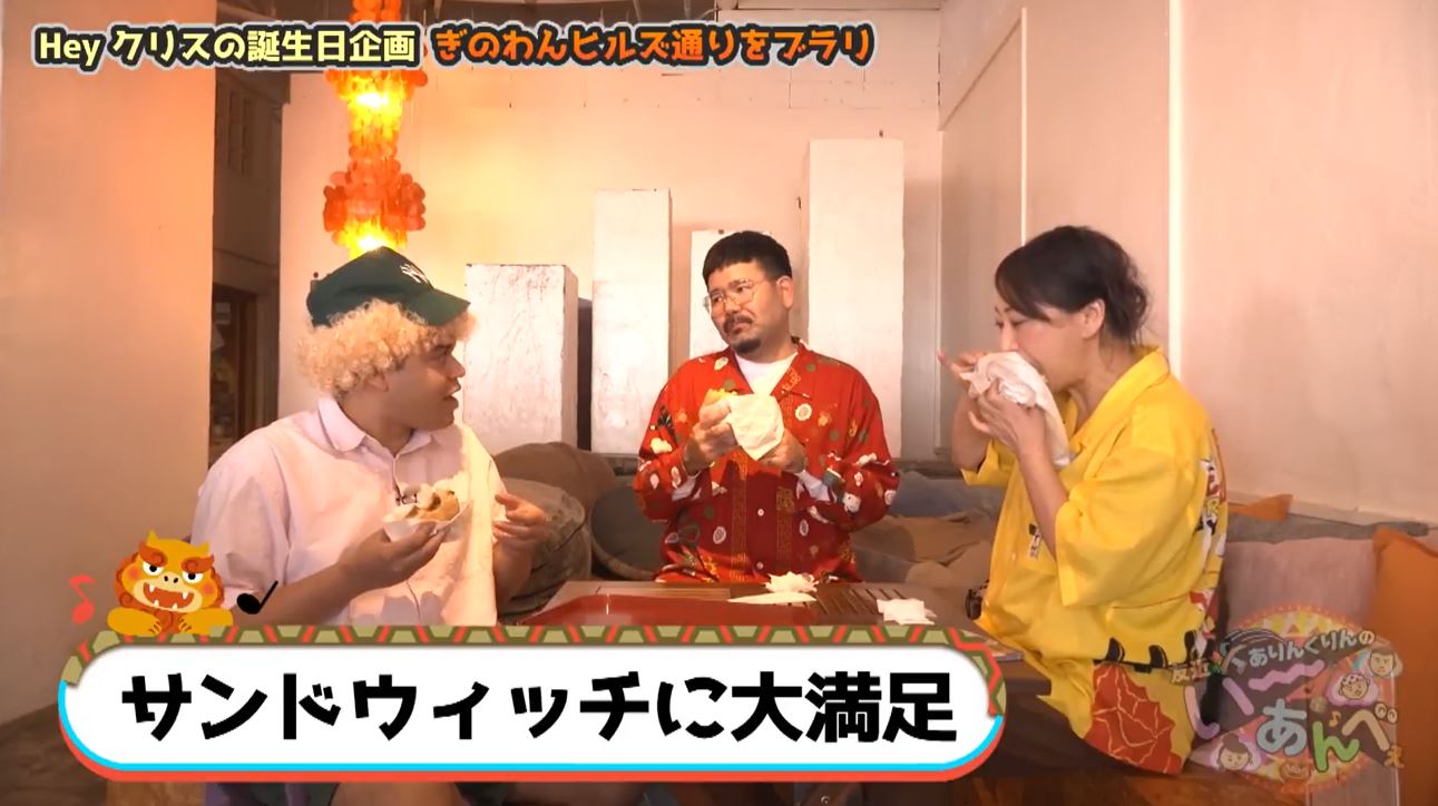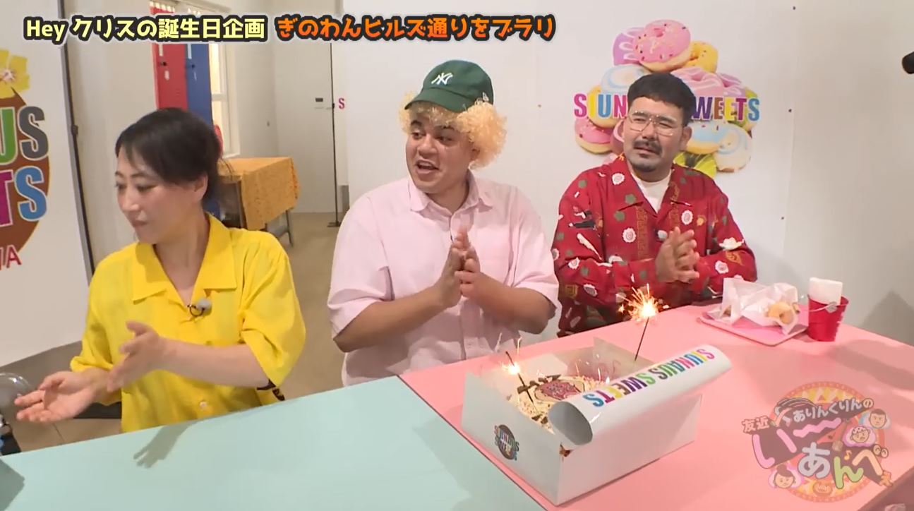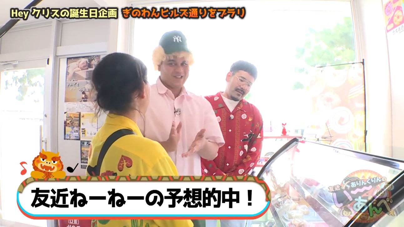 クリスさんの誕生日をお祝いするため、ぎのわんヒルズ通りにやってきた友近ねーねーとありんくりんの2人。