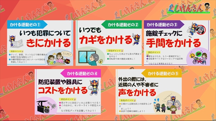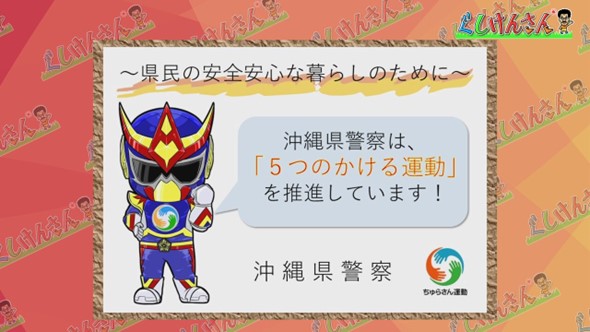 「犯罪のない、安全で安心して暮らせる沖縄県を実現するため、県警察ではパトロールの強化や防犯講話、SNSを活用した情報発信を行っているちゅら。地域住民の皆さん、関連企業・団体など、県民総ぐるみで防犯に取り組む『ちゅらさん運動』を推進しています」