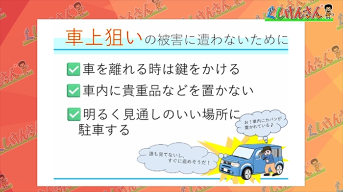 防犯について学ぶ場面はまだまだ続く。車上荒らし対策として、安全安心マンが3つのポイントを紹介してくれた。