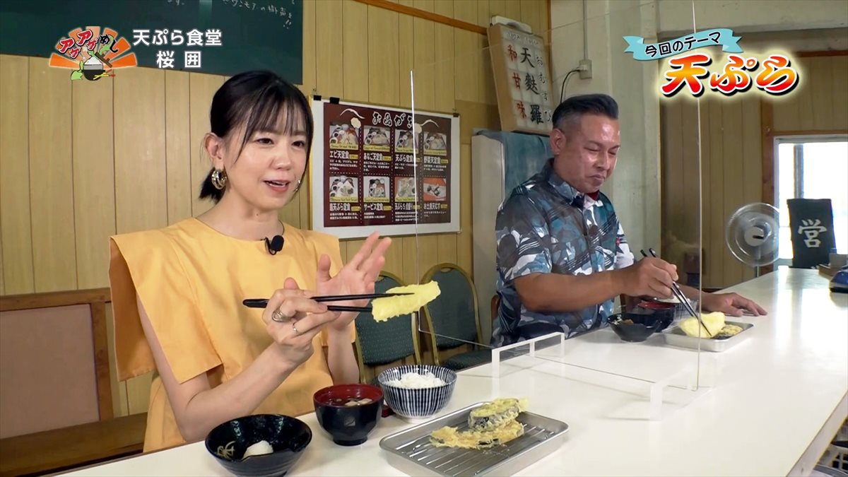 アゲアゲめし。今回のテーマは「天ぷら」。紹介するのは、那覇市壺屋にある「天ぷら食堂桜囲」。店内には大きなコの字カウンターがあり、目の前の調理場で天ぷらを揚げてくれる。