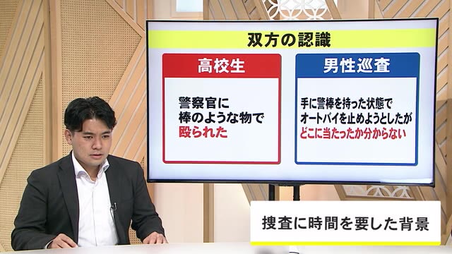 当時、現場にいたのは高校生と男性巡査の2人だけで、防犯カメラもなく目撃者もいなかった。高校生は「警察官に棒のようなもので殴られた」と話すいっぽう、男性巡査は「手に警棒を持った状態でオートバイを止めようとしたが、どこに当たったかわからない」と釈明し双方の認識に食い違いがあった。
