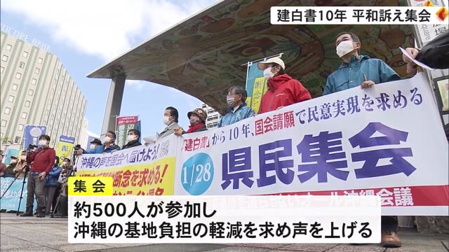 「建白書」の提出から10年の節目に、オール沖縄会議が開いた集会には約500人が参加し沖縄の基地負担の軽減を求め声をあげた。