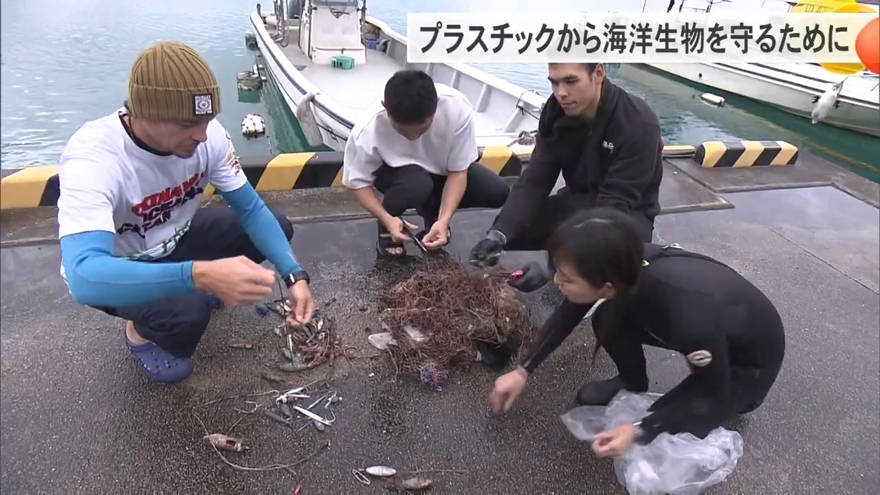漁港に戻った1隻の船から運び出されたのは、残波岬の沖、海中30メートルから回収されたルアーや釣り糸だ。