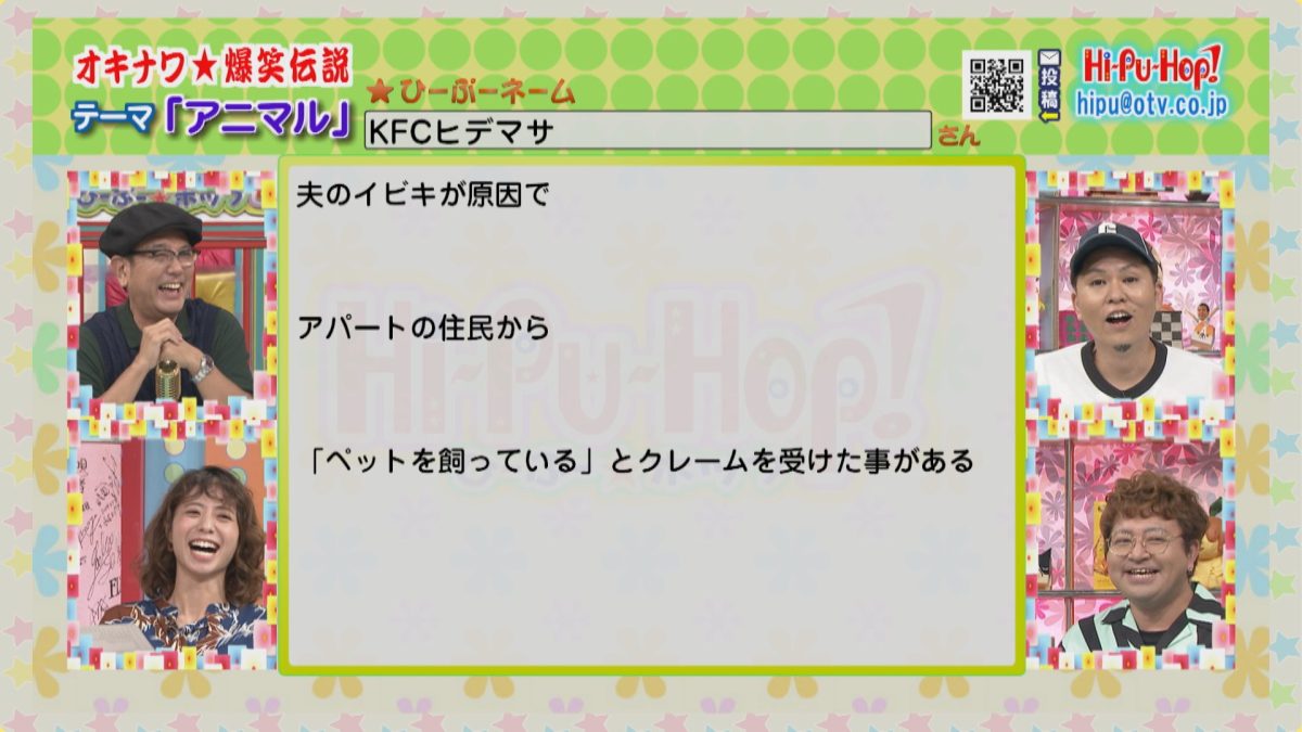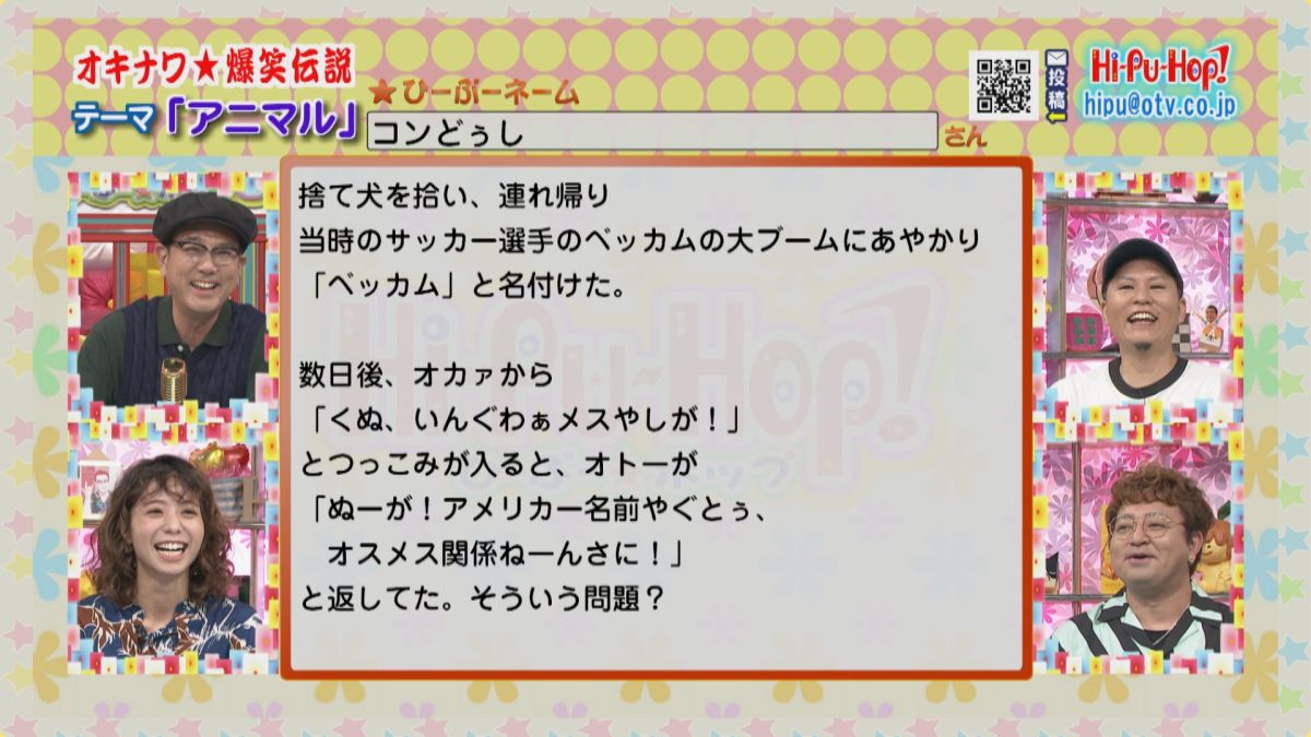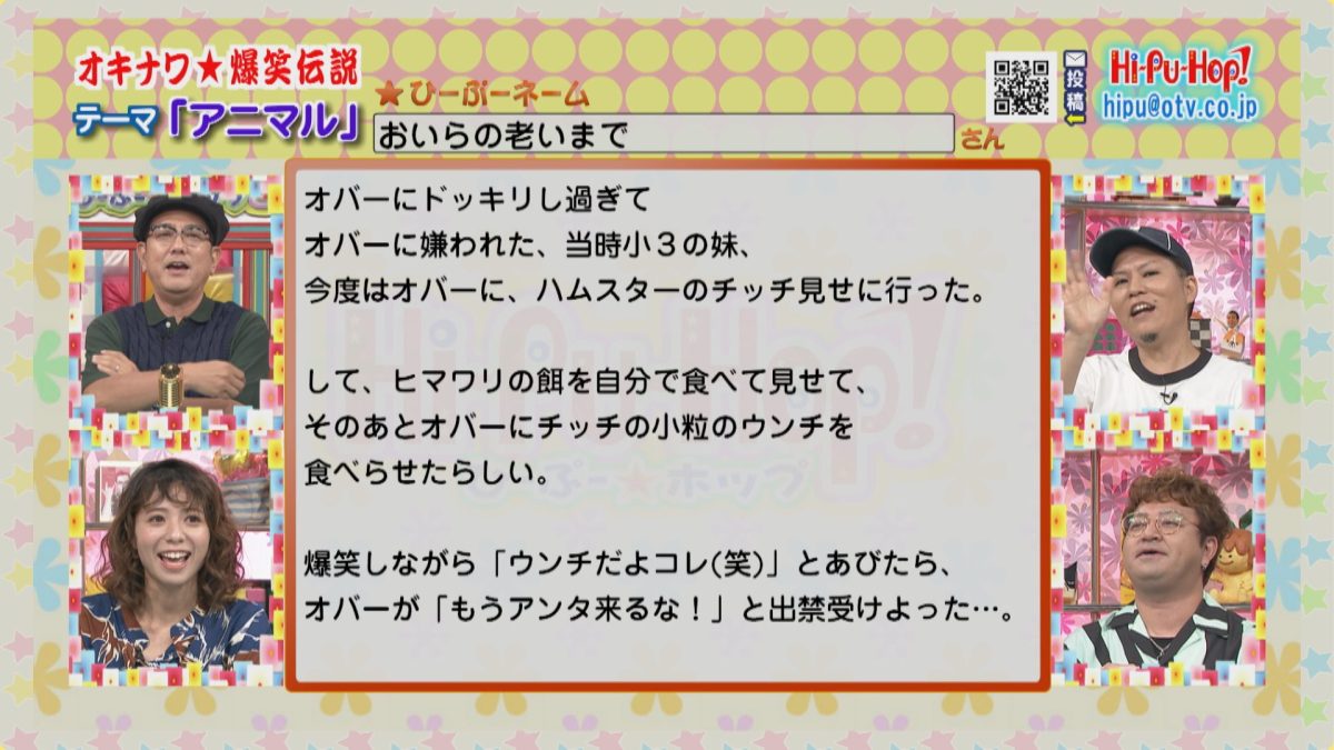 ラジオみたいなテレビ番組をコンセプトに視聴者からの爆笑エピソードを紹介している「ひーぷー☆ホップ」!沖縄の兄貴的な存在であるひーぷー(真栄平仁)を中心に、こきざみインディアンの2人とかーこーが番組を盛り上げます!人気コーナー・オキナワ爆笑伝説の2025年10月4日のお題は「アニマル」です。