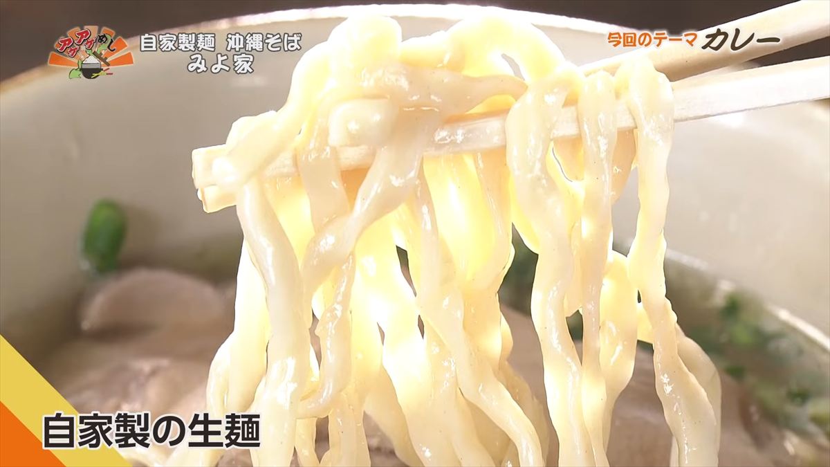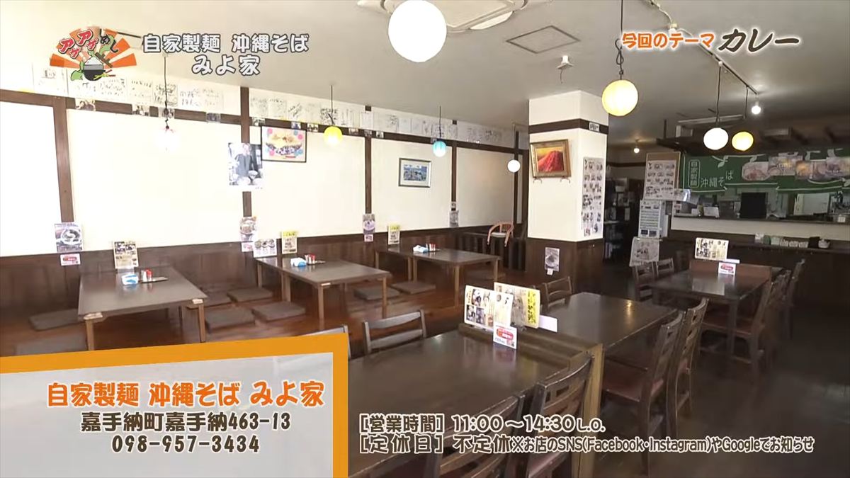 アゲアゲめし、今回のテーマは「カレー」。紹介するのは嘉手納町嘉手納にある「自家製麺 沖縄そば みよ家」。テーブル席や座敷もあって、家族でも入りやすい広々とした店内。自家製麺を使った沖縄そばを始め、定食メニューの種類も豊富。