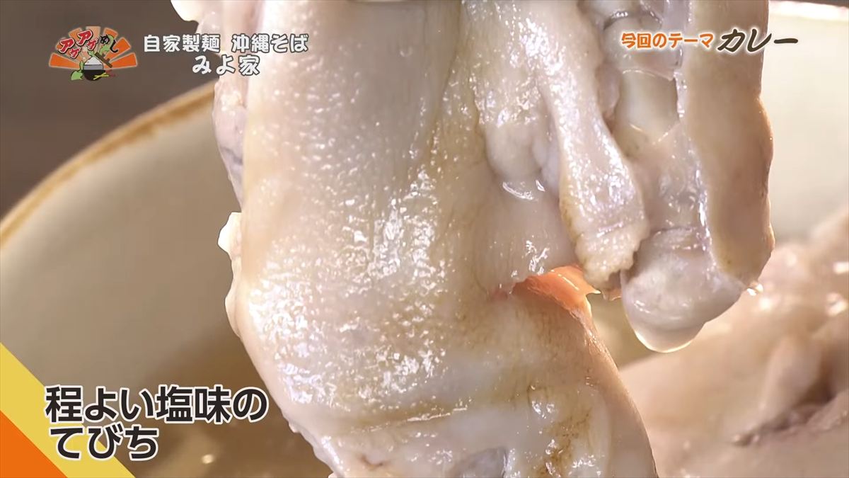 こちら「みよ家」の人気メニュー「スーチカーてびちそば」。スーチカーとは沖縄のことばで塩漬けという意味で、塩漬けにしてやわらかく炊いたてびちが乗っかった沖縄そば。さっそくスーチカーてびちをいただきます。