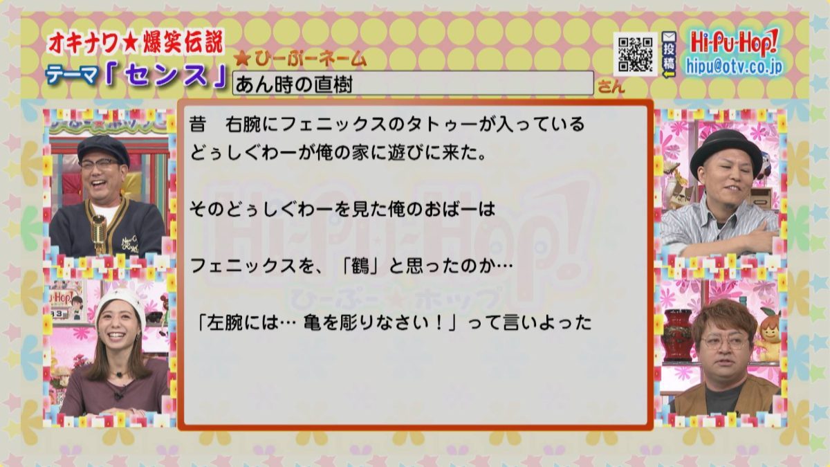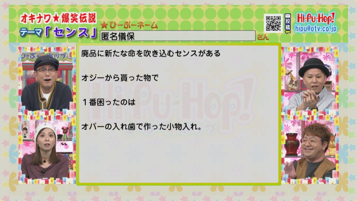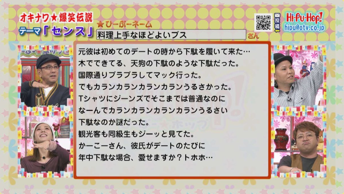 ラジオみたいなテレビ番組をコンセプトに視聴者からの爆笑エピソードを紹介している「ひーぷー☆ホップ」!沖縄の兄貴的な存在であるひーぷー(真栄平仁)を中心に、こきざみインディアンの2人とかーこーが番組を盛り上げます!人気コーナー・オキナワ爆笑伝説の2025年11月1日のお題は「センス」です。