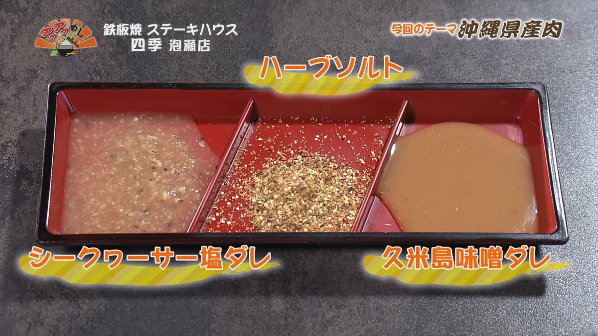 「ステーキハウス四季 泡瀬店」で味わえるキビまる豚のおいしさに感動。キビまる豚の甘みに加え、味わいの違う二つのタレもよく合う鉄板焼き。気になった方はぜひお試しを。