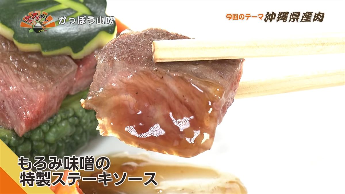 アゲアゲめし、今回のテーマは「沖縄県産肉」。紹介するのは名護市大東にある「かっぽう山吹」。座敷や個室、そして宴会にも対応できる上品な店内。ランチを始め、ディナーのコース料理も人気な老舗の割烹料理屋。