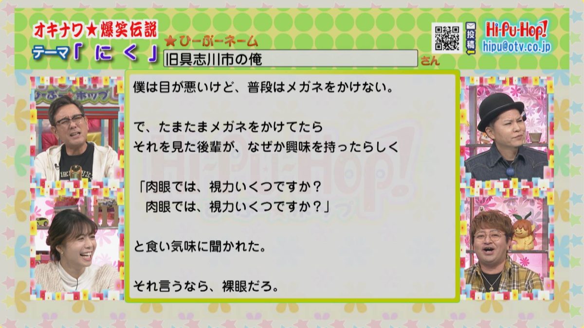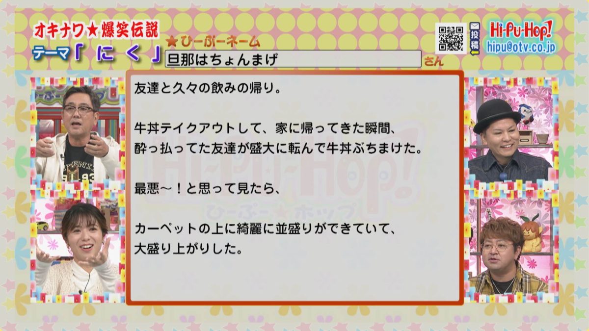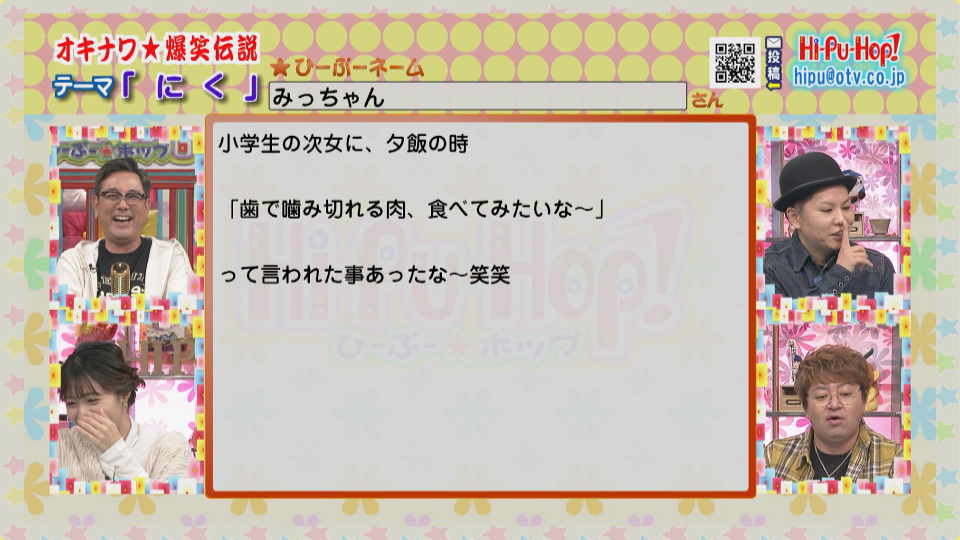 ラジオみたいなテレビ番組をコンセプトに視聴者からの爆笑エピソードを紹介している「ひーぷー☆ホップ」!沖縄の兄貴的な存在であるひーぷー(真栄平仁)を中心に、こきざみインディアンの2人とかーこーが番組を盛り上げます!人気コーナー・オキナワ爆笑伝説の2025年11月29日のお題は「にく」です。