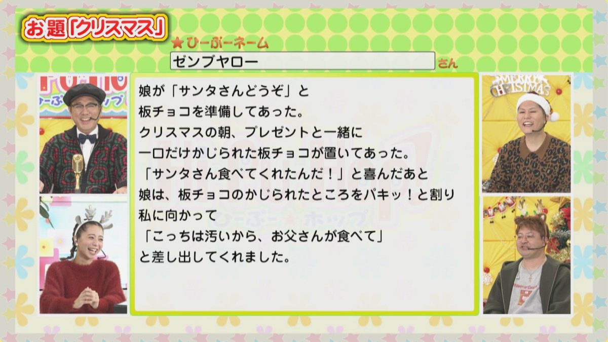 ラジオみたいなテレビ番組をコンセプトに視聴者からの爆笑エピソードを紹介している「ひーぷー☆ホップ」!沖縄の兄貴的な存在であるひーぷー(真栄平仁)を中心に、こきざみインディアンの2人とかーこーが番組を盛り上げます!人気コーナー・オキナワ爆笑伝説の2025年12月20日のお題は「クリスマス」です。