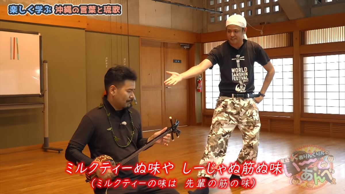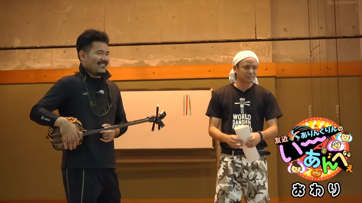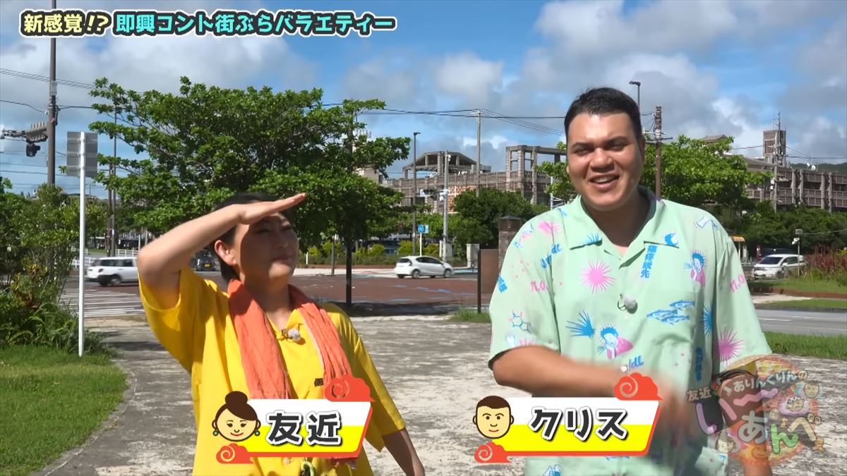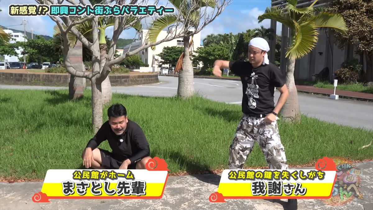 「今日の舞台は名護市の中央公民館やて!」と友近さんがありんくりんのクリスと歩いてきますが、本日は、ありんくりんのりゅうたは不在のようです。しばらく歩ていると、何やら踊りの練習をしているお兄さん方がいらっしゃいます。よく見ると、沖縄で大人気のまさとし先輩とじゅん選手です!