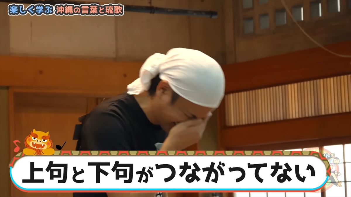 すると先生から「じゃあ、お二人で即興の琉歌を作ってみましょうか?」と無茶ぶりが!指名されたのは、まさとし先輩とじゅん選手。果たして、30音に想いを込めることはできるのか!?