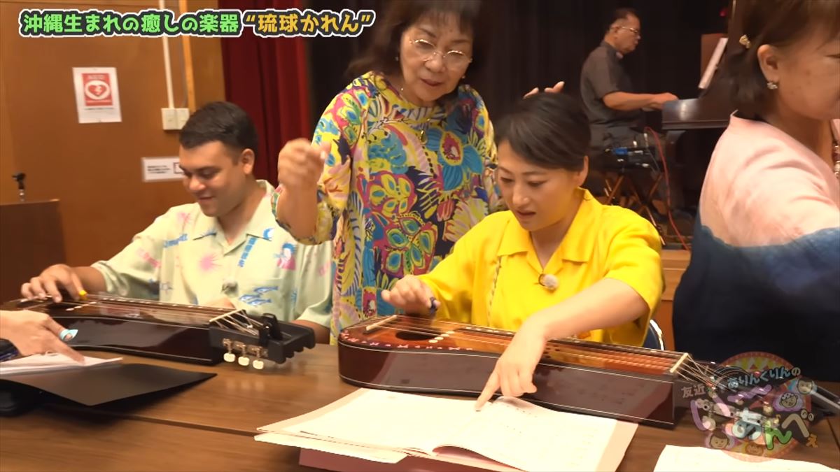 部屋から聞こえてくる優しい音色に誘われドアを開けると、そこには見慣れない楽器が。「これ、なんていう楽器ですか?」一行は初めて聞く「琉球かれん」に興味津々です。