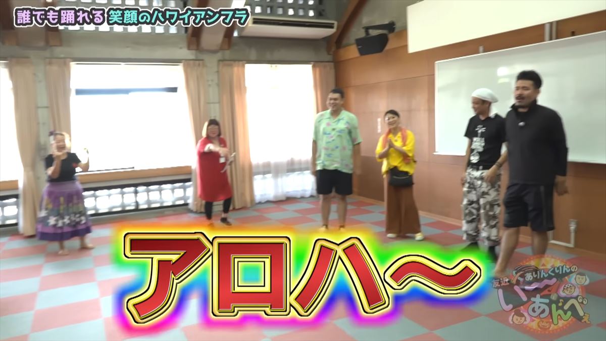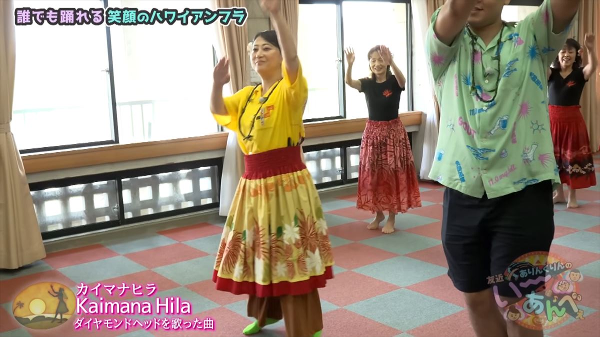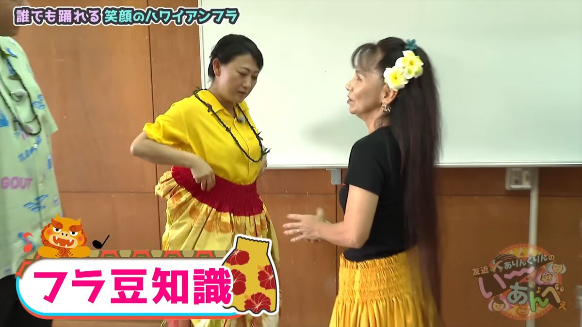 友近さんたちも早速フラダンスを体験!素敵なパウスカートを身につけた友近に、先生から「実はね、フラは神に捧げる踊りだから、スカートは上からかぶるように着るのがマナーなんですよ」と豆知識が。神聖な踊りであることを知り、一行も神妙な面持ちに。