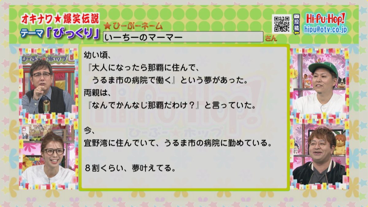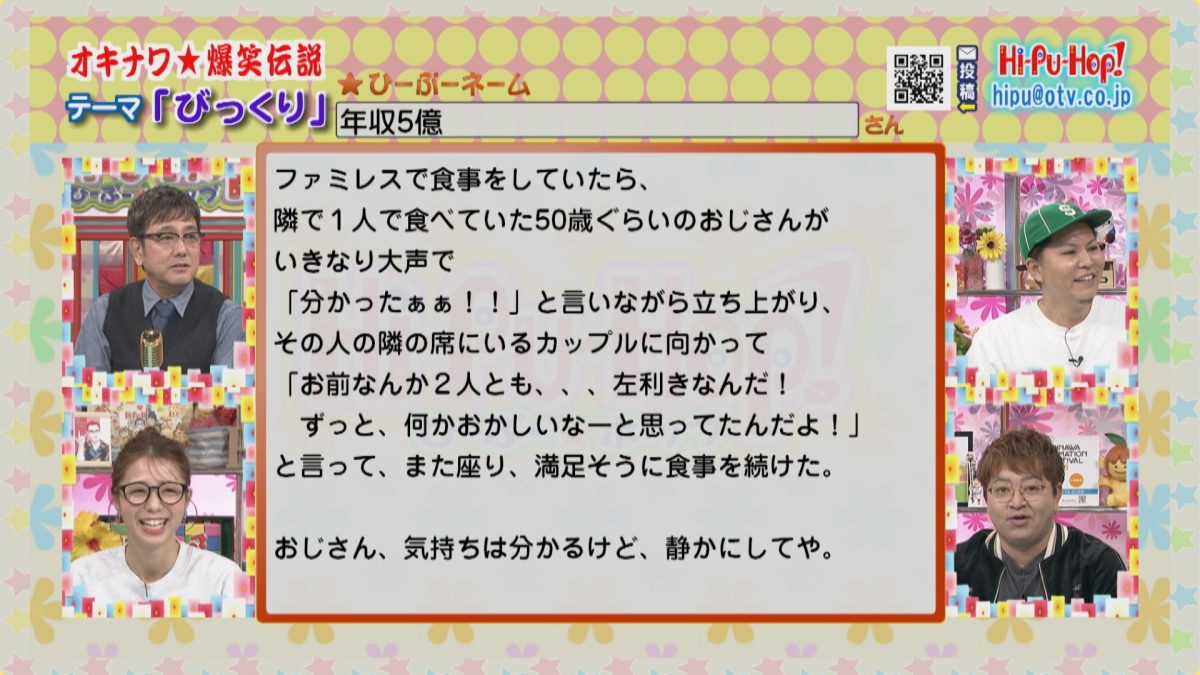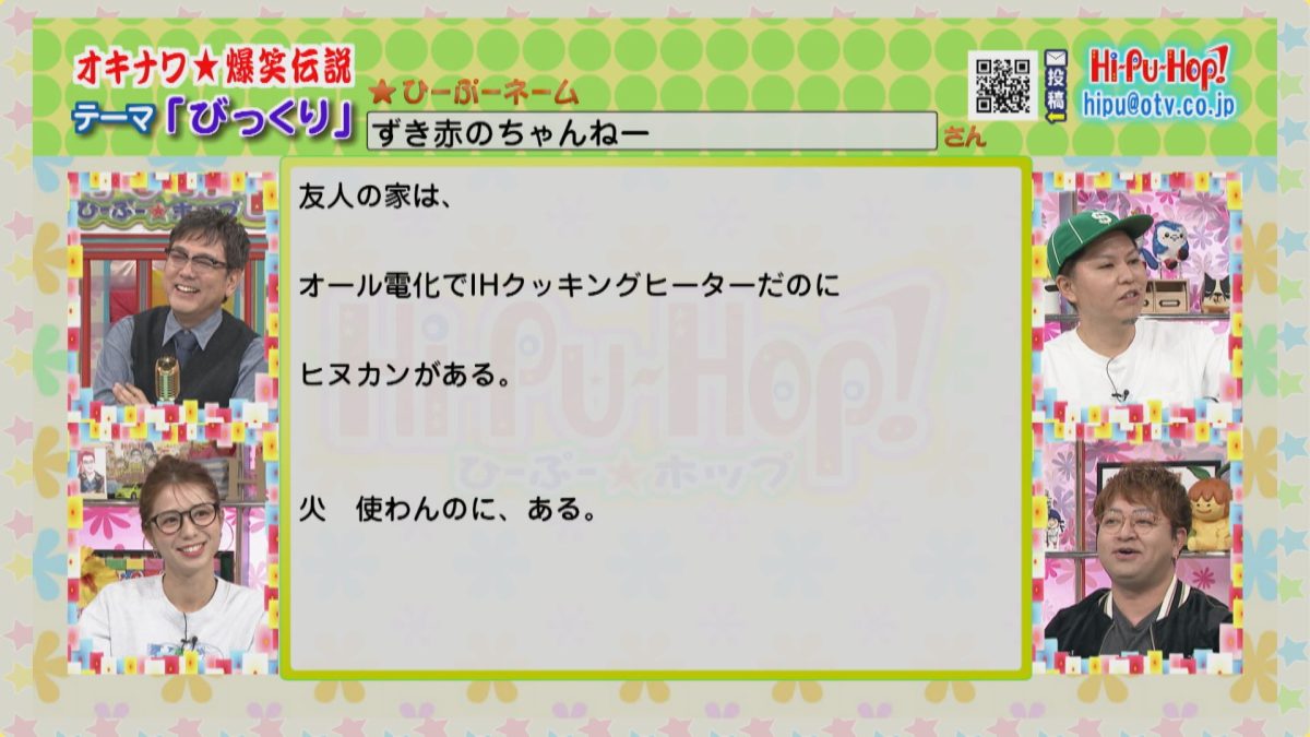 ラジオみたいなテレビ番組をコンセプトに視聴者からの爆笑エピソードを紹介している「ひーぷー☆ホップ」!沖縄の兄貴的な存在であるひーぷー(真栄平仁)を中心に、こきざみインディアンの2人とかーこーが番組を盛り上げます!人気コーナー・オキナワ爆笑伝説の2026年1月24日のお題は「びっくり」です。
