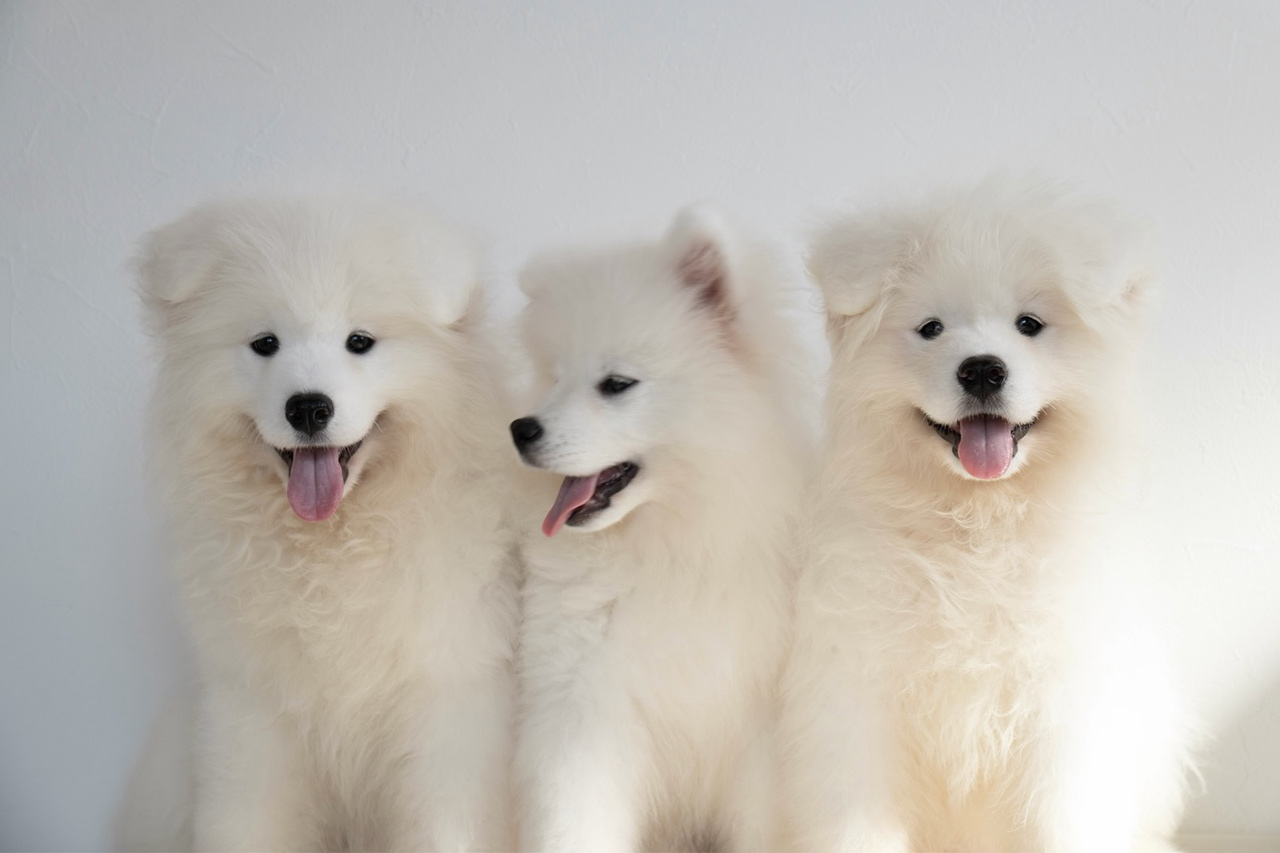 真っ白でふわふわ、そして見る人の心まで明るくしてくれる“サモエドスマイル”をもつ3匹のサモエド姉妹。