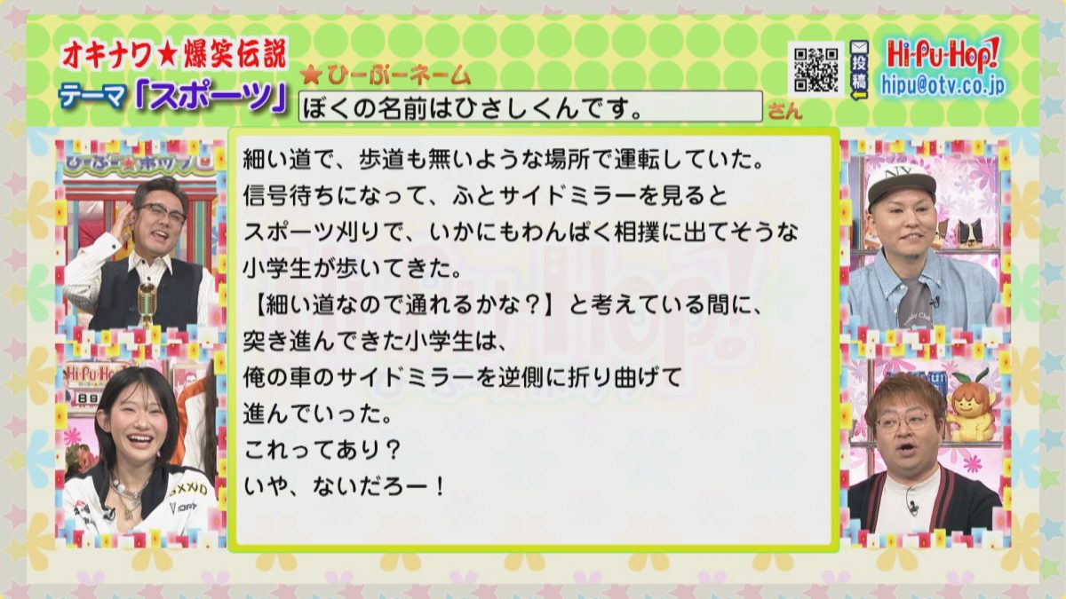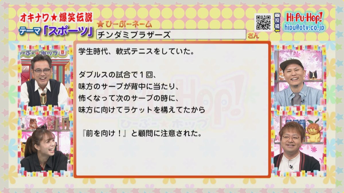 ラジオみたいなテレビ番組をコンセプトに視聴者からの爆笑エピソードを紹介している「ひーぷー☆ホップ」!沖縄の兄貴的な存在であるひーぷー(真栄平仁)を中心に、こきざみインディアンの2人とかーこーが番組を盛り上げます!人気コーナー・オキナワ爆笑伝説の2026年2月21日のお題は「スポーツ」です。