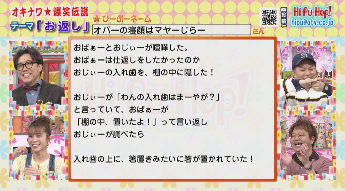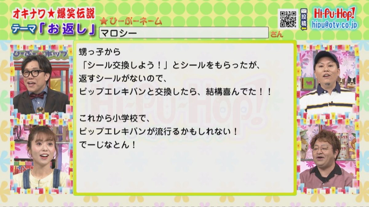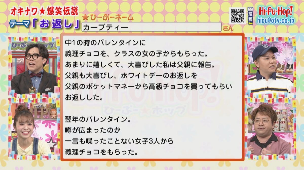 ラジオみたいなテレビ番組をコンセプトに視聴者からの爆笑エピソードを紹介している「ひーぷー☆ホップ」!沖縄の兄貴的な存在であるひーぷー(真栄平仁)を中心に、こきざみインディアンの2人とかーこーが番組を盛り上げます!人気コーナー・オキナワ爆笑伝説の2026年3月14日のお題は「お返し」です。