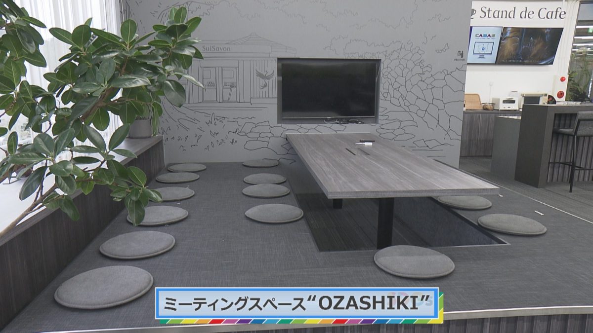オフィスに入るとすぐ目に入るのは、まるでカフェスタンドのようなカウンターに肩を並べて会話ができるベンチや、掘りごたつでリラックスしながらミーティングができる「OZASHIKI」というスペースなど開放感のある共有スペース。
