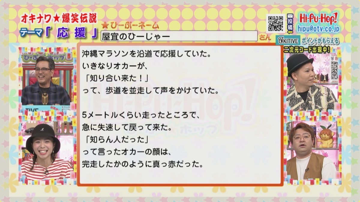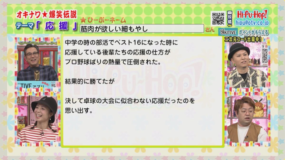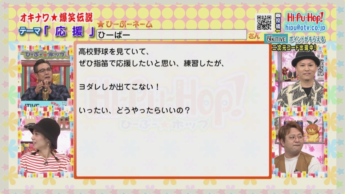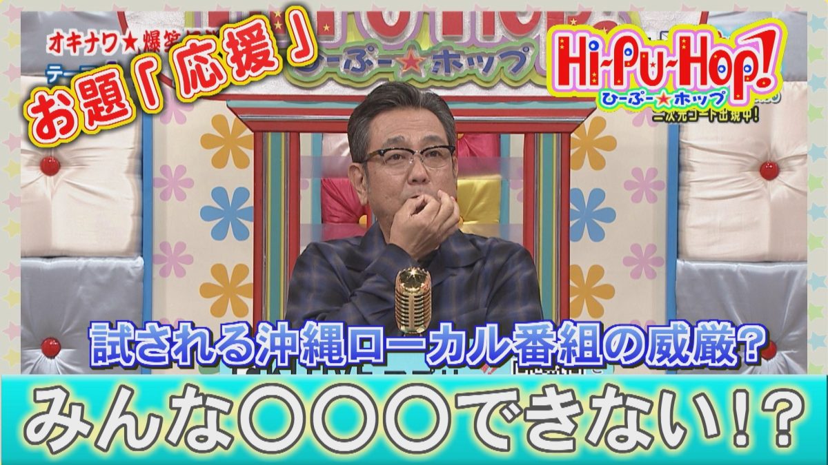 ラジオみたいなテレビ番組をコンセプトに視聴者からの爆笑エピソードを紹介している「ひーぷー☆ホップ」!沖縄の兄貴的な存在であるひーぷー(真栄平仁)を中心に、こきざみインディアンの2人とかーこーが番組を盛り上げます!人気コーナー・オキナワ爆笑伝説の2026年3月28日のお題は「応援」です。