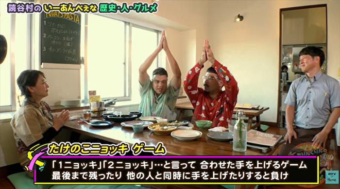 「たけのこ、たけのこ、ニョッキッキ」の掛け声に合わせて、「1ニョッキ」「2ニョッキ」と順番に言っていくゲームで、他の人とかぶったり、最後に言ったりすると負けというルール。