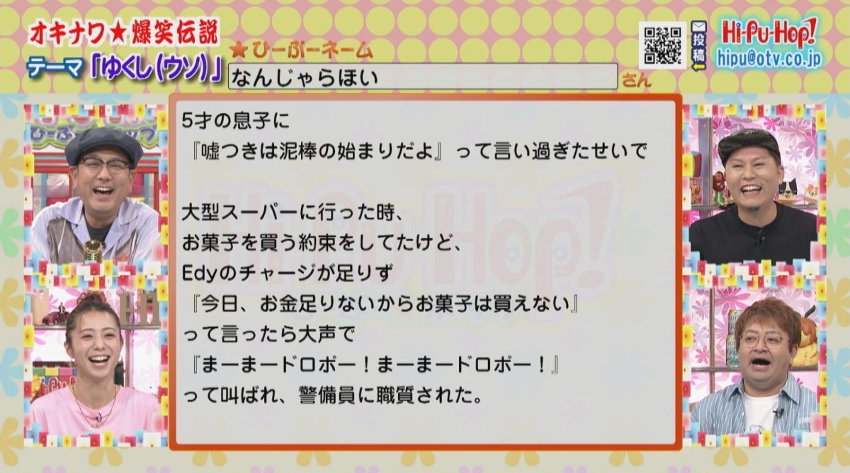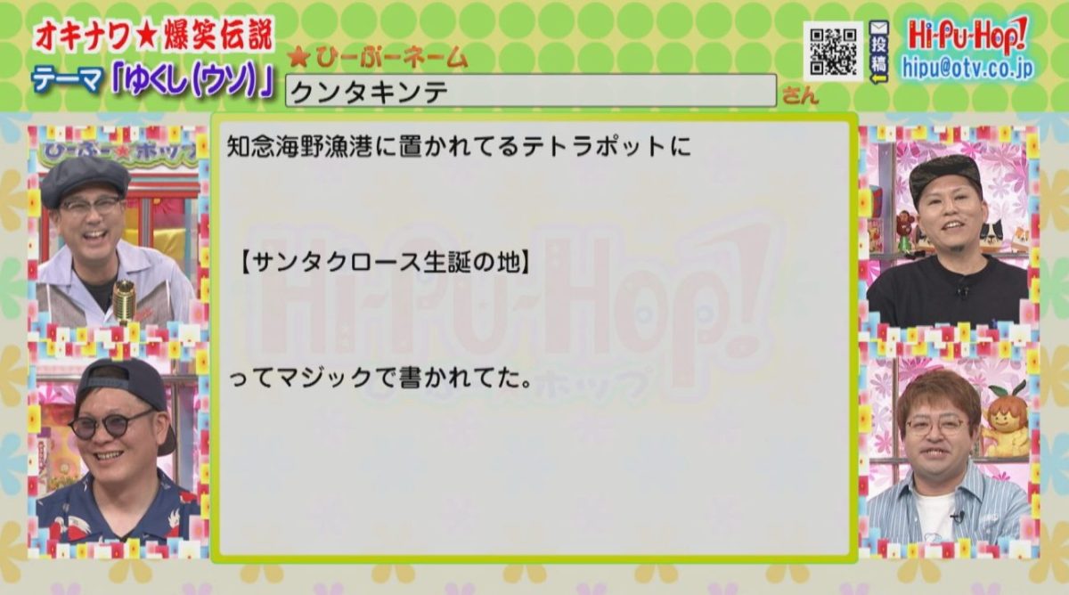 ラジオみたいなテレビ番組をコンセプトに視聴者からの爆笑エピソードを紹介している「ひーぷー☆ホップ」!沖縄の兄貴的な存在であるひーぷー(真栄平仁)を中心に、こきざみインディアンの2人とかーこーが番組を盛り上げます!人気コーナー・オキナワ爆笑伝説の2026年4月4日のお題は「ゆくし(うそ)」です。