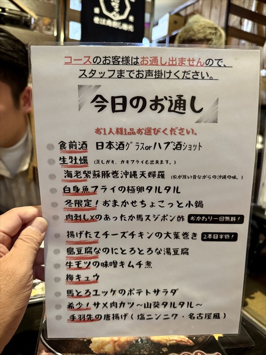 食前酒、日本酒グラス or ハブ酒ショット、生牡蠣、白身魚フライ、馬スジポン酢、チーズチキン大葉巻き、牛モツの味噌キムチ煮などなど……。