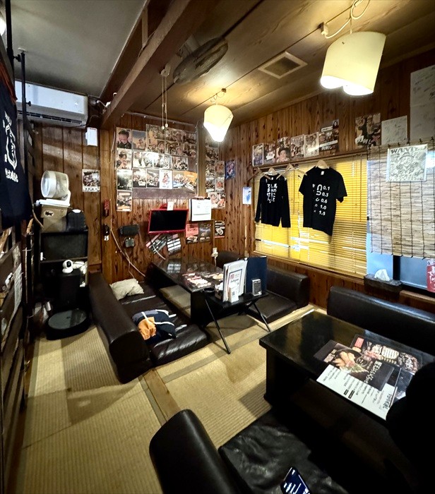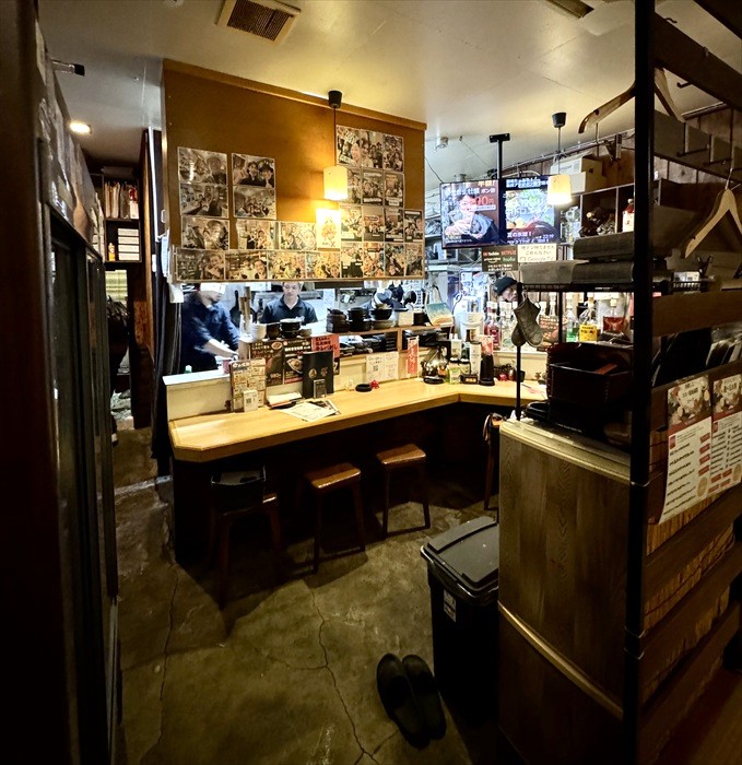 カウンターとテーブル席には貼り紙やメニュー、写真、提灯、そして独特の熱量。