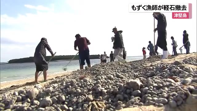 津堅島で勝連漁協のもずく漁師が軽石を撤去